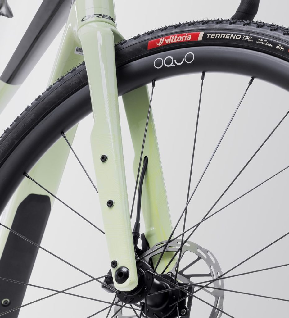 - Fourche : Orbea Terra Race ICR, tout carbone, compatible avec les tubes de direction coniques de 1-1/8" à 1,5", axe traversant 12x100 mm, filetage M12xP1, système de fixation multiple MMS, prêt pour les garde-boue.