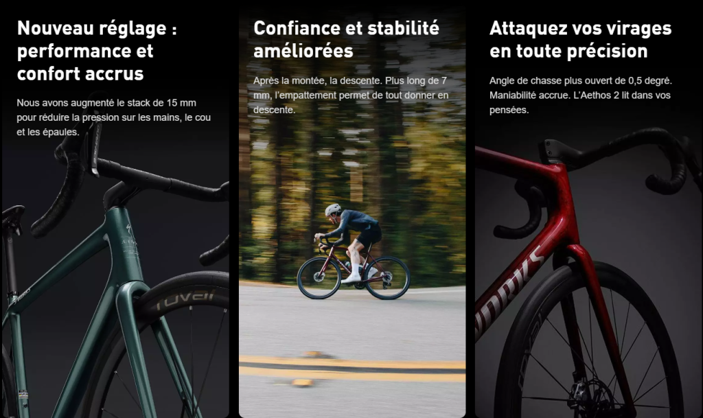 Grâce à un dégagement pneumatique augmenté, des composants perfectionnés et une géométrie optimisée à partir de milliers de données, il permet à un plus grand nombre de cyclistes de vivre une expérience unique. L’Aethos 2 casse les codes… pour l’amour du vélo.