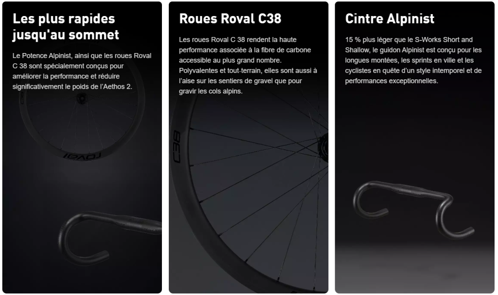 - Cadre : Aethos 2 FACT 10r Carbon, Rider First Engineered™, boîtier de pédalier fileté, passage de câbles dissimulé, axe traversant 12 x 142 mm